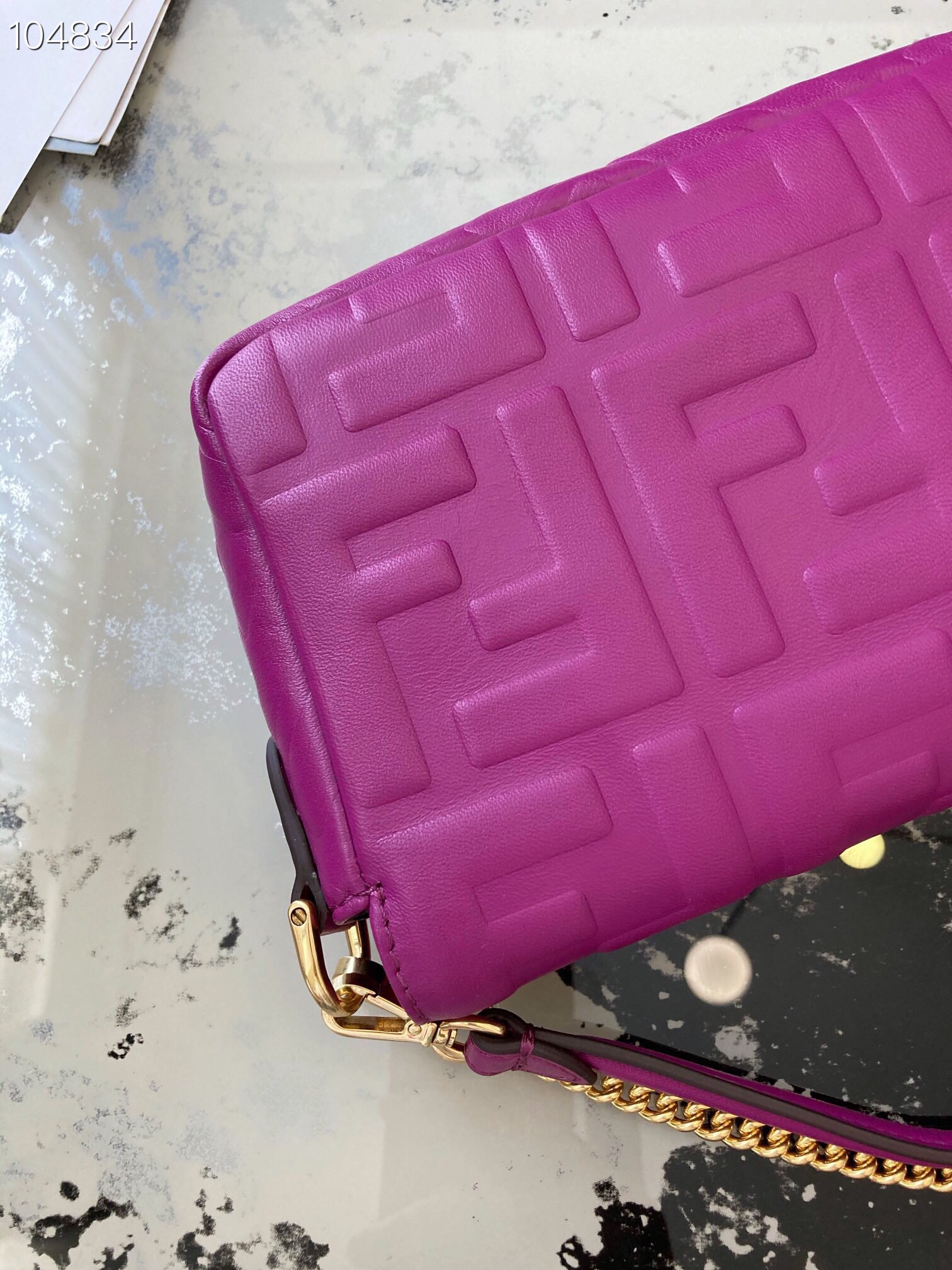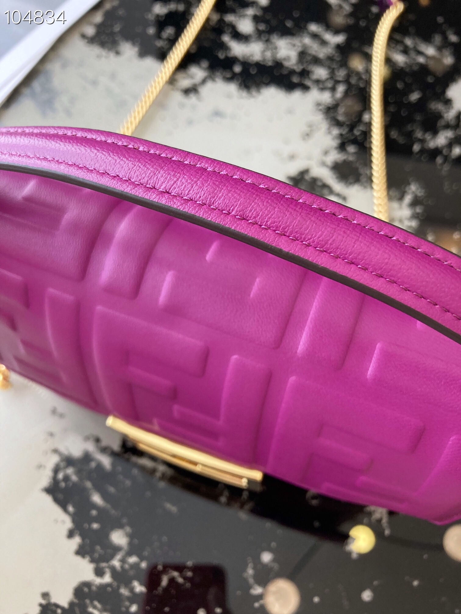 Iconic mini Baguette bag made of soft nappa leather with a three-dimensional texture FF motif. Decorated with an FF clasp.