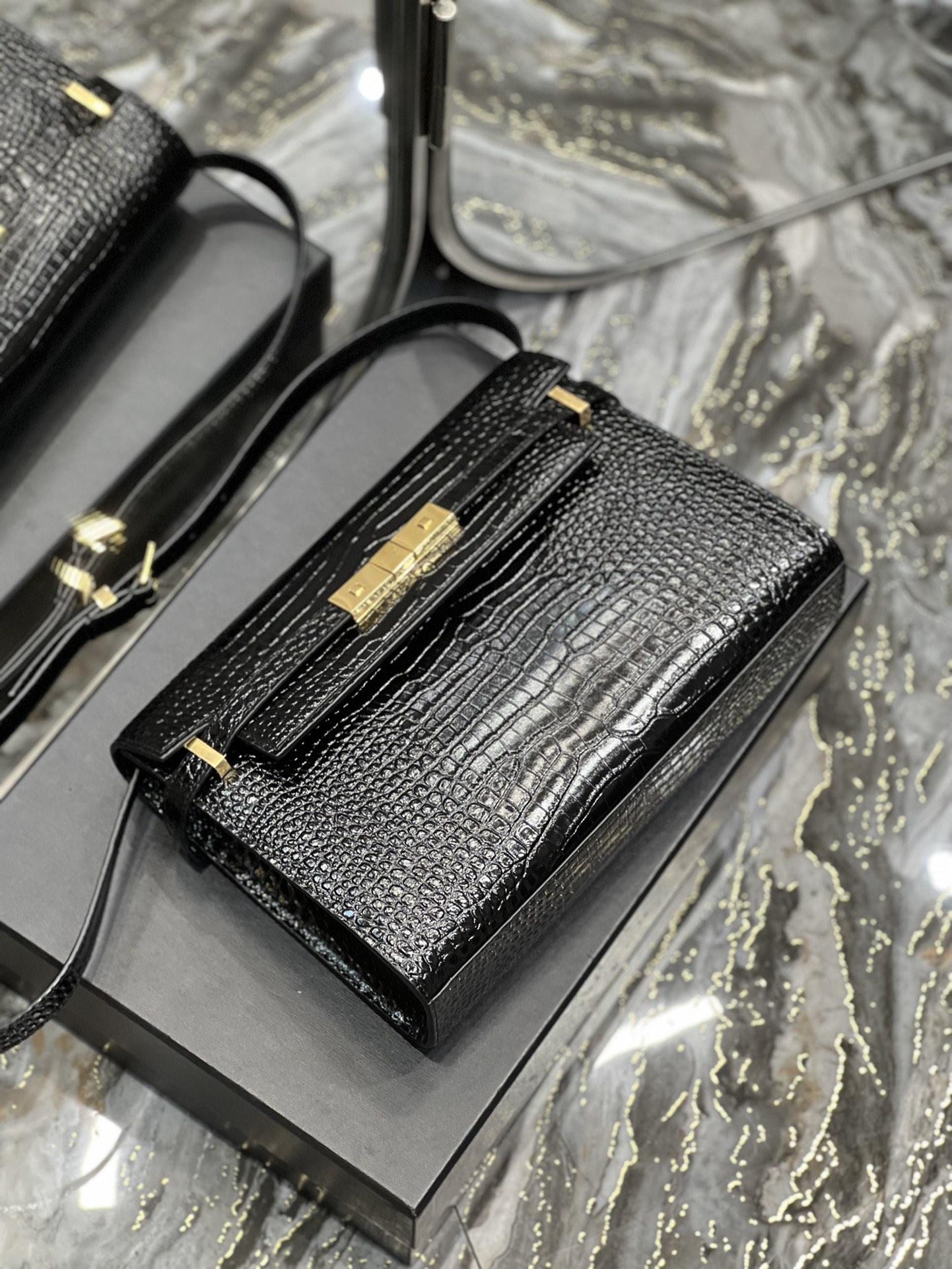 MANHATTAN IN CROCODILE-EMBOSSED SHINY LEATHER